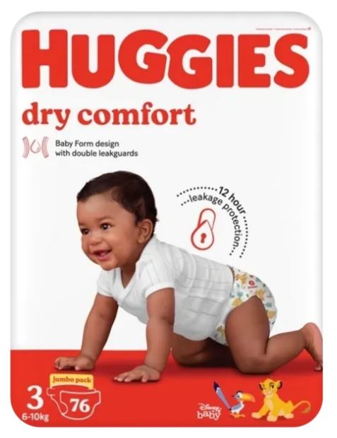 Huggies Dry comfort diapers are available in jumbo packs, including size 3 with 76 diapers and size 4 with 66 nappies. For those looking for baby diapers for sale, our Huggies Dry comfort range guarantees our most gentle protection with fasten-anywhere tabs for a perfect fit.