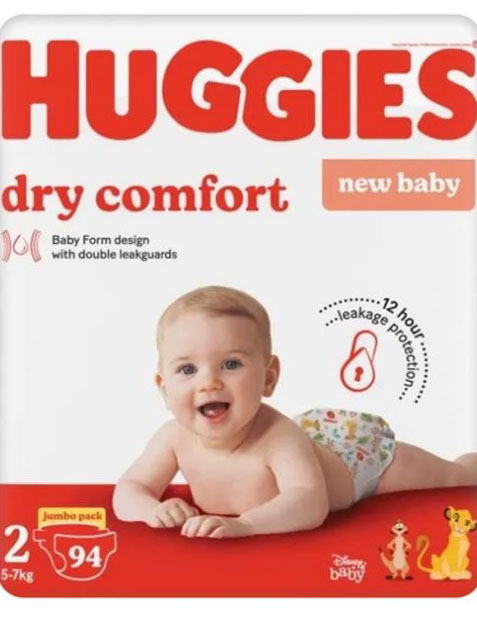 Huggies Dry Comfort diapers in a jumbo pack size 2, featuring 94 diapers for your little one, are now available for purchase. Explore our selection of baby diapers for sale, including the trusted Huggies Dry Comfort diapers and the premium Levies nappies.